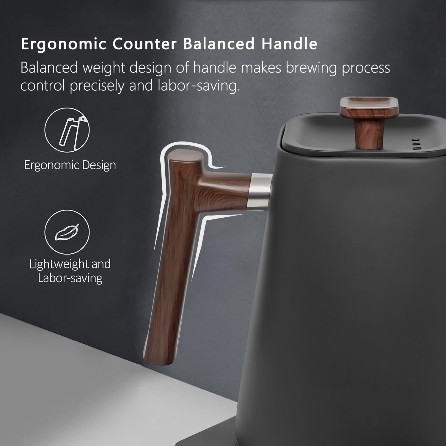 Counterbalanced walnut wood color handle lets you pour in style.