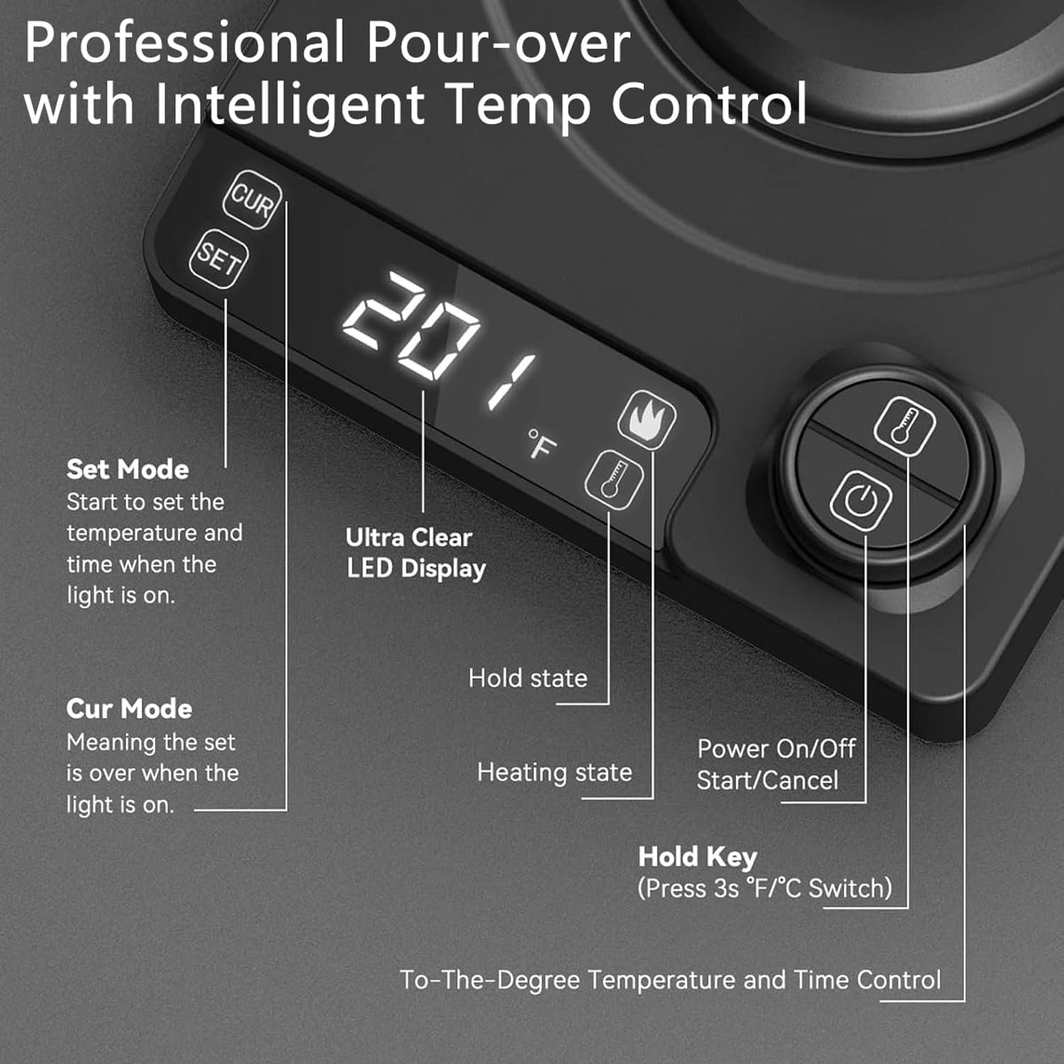 Precise Temperature Control: The LCD screen showcases your chosen Set Temp and Real-Time Temp,104 ° F-212 ° F temperature control,Enjoy your beverages at the perfect temperature with ±1°F accuracy, ensuring optimal flavor and aroma.
