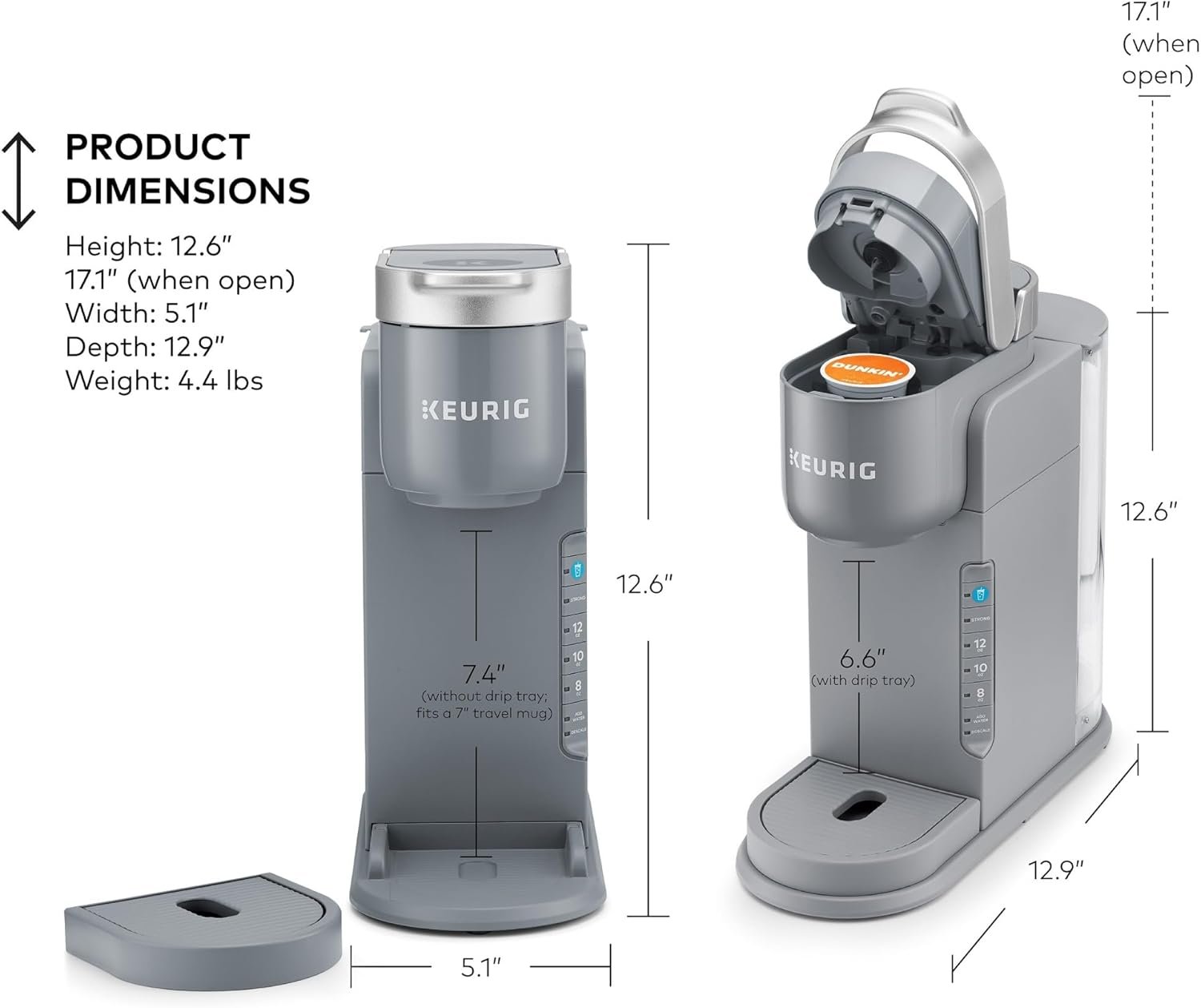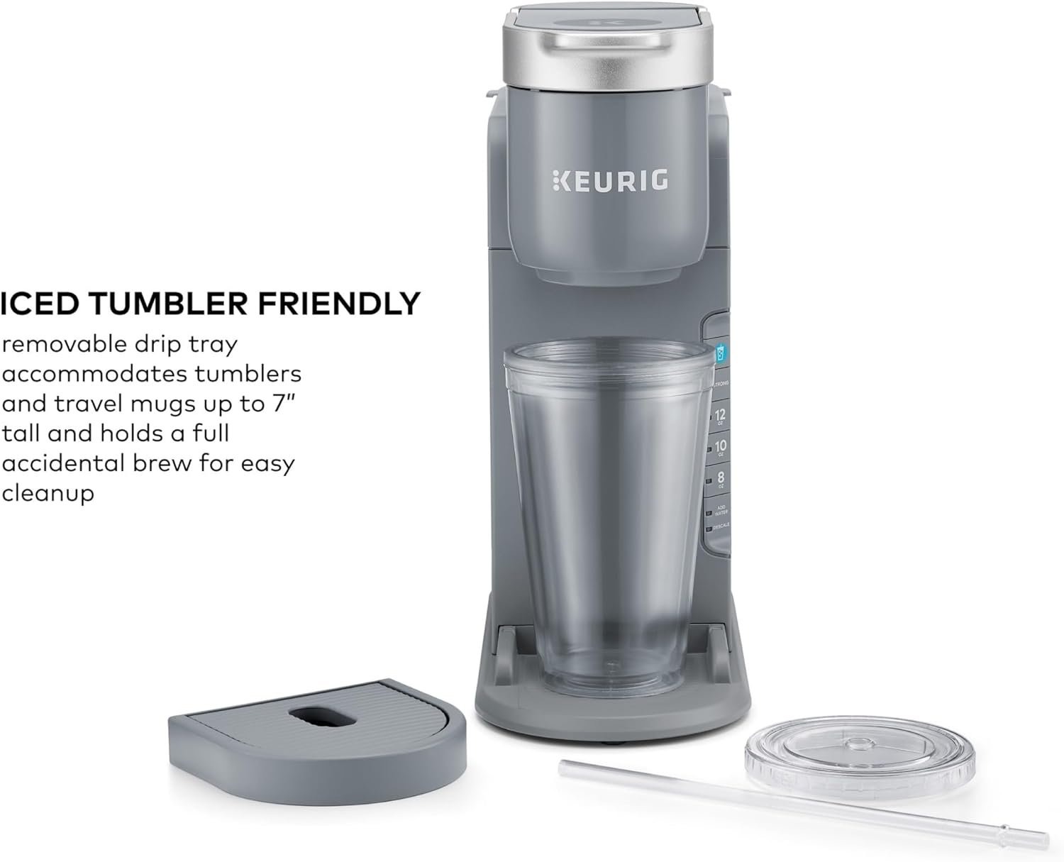 ICED TUMBLER FRIENDLY: Removable drip tray accommodates tumblers and travel mugs up to 7” tall and holds a full accidental brew for easy cleanup.