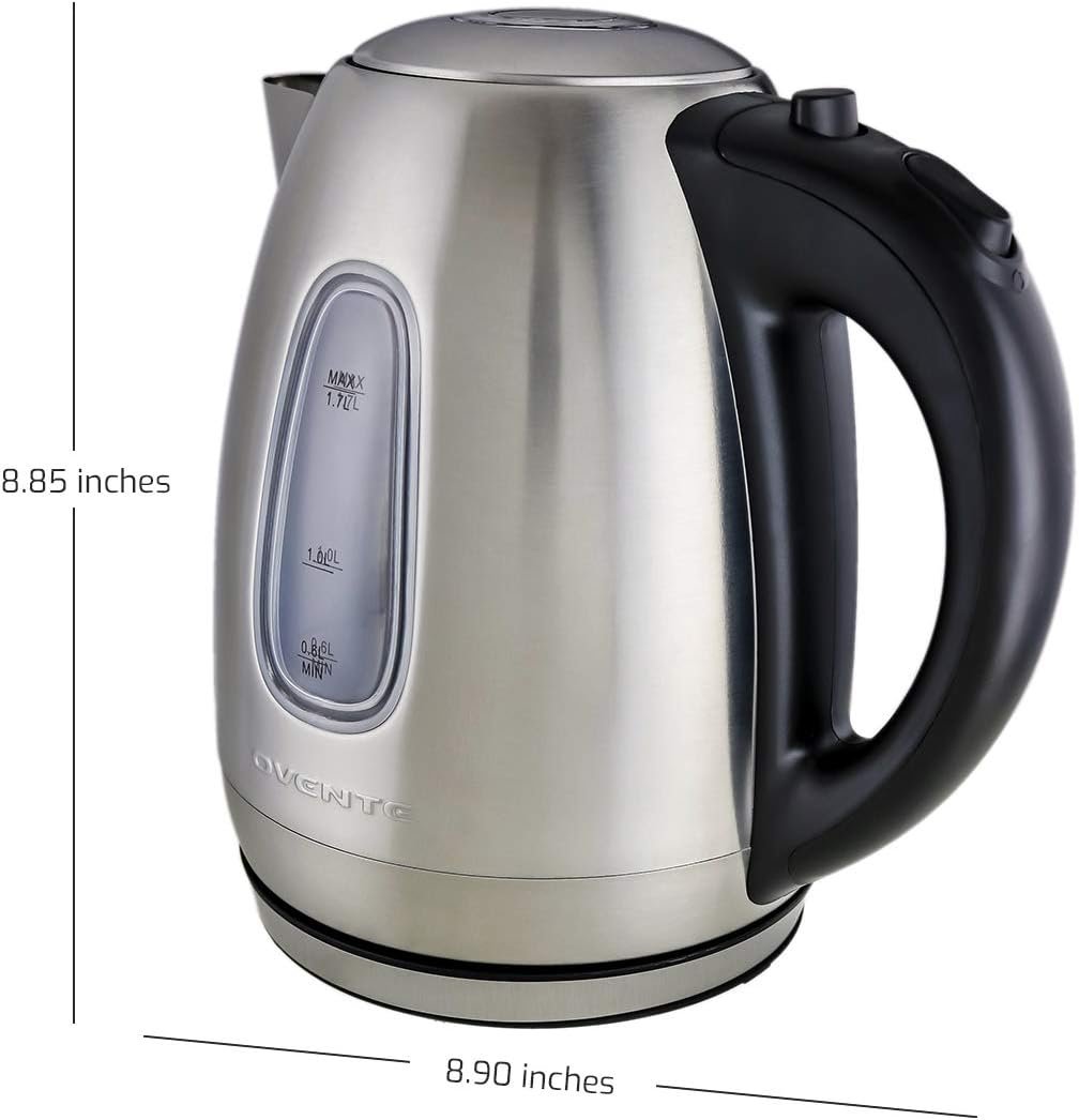 OVENTE Electric Kettle Stainless Steel Instant Water Boiler BPA Free 1.7 Liter 1100 Watts Fast Boiling with Cordless Body and Automatic Shut Off Safe and Perfect for Tea Coffee Milk, Silver KS96S
